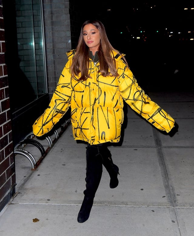 The "God Is a Woman" singer showed off another one of her giant puffy jackets -- this one was a yellow graffiti coat by Adaptation -- while heading into a recording studio in New York City on Dec. 11.