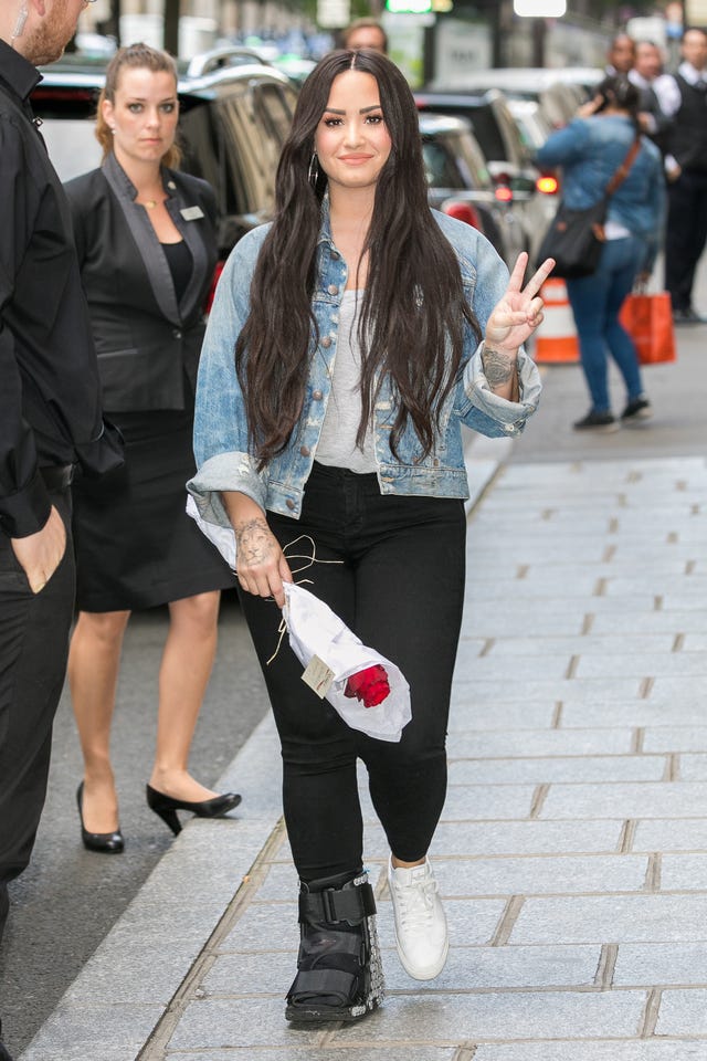 No boot is going to slow her down! Lovato -- who fractured her foot last month -- held onto a rose and flashed a peace sign as she carefully walked through Paris, France, on June 4.
