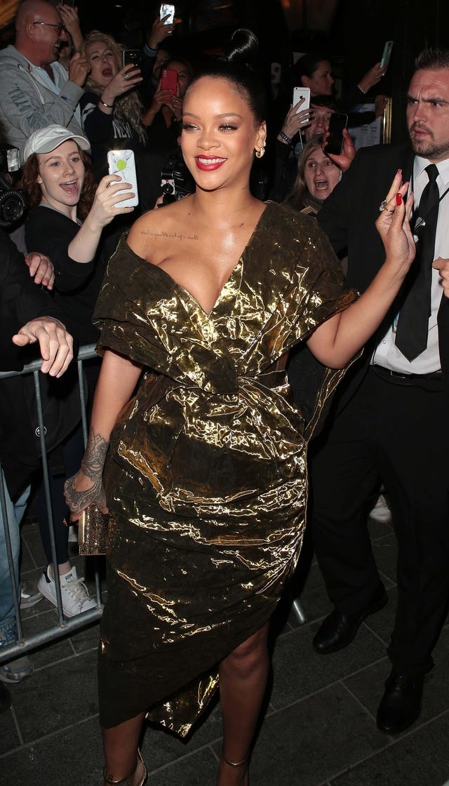 Rihanna smiled for fans and photographers outside the Ocean's 8 premiere after-party at the Tate Modern art museum on London, England, on June 13. The singer/actress, who stars in the heist comedy as a computer genius named Nine Ball, shimmered in a stunning, metallic gold Poiret dress that she paired with a Christian Louboutin clutch. Ocean's 8 is currently in theaters.