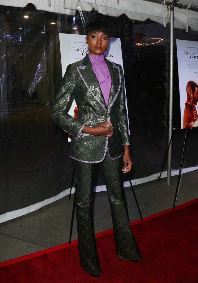 The 27-year-old actress highlighted the lilac piping of her moss green sequined suit with an orchid bow blouse at a Los Angeles screening of her film, If Beale Street Could Talk.