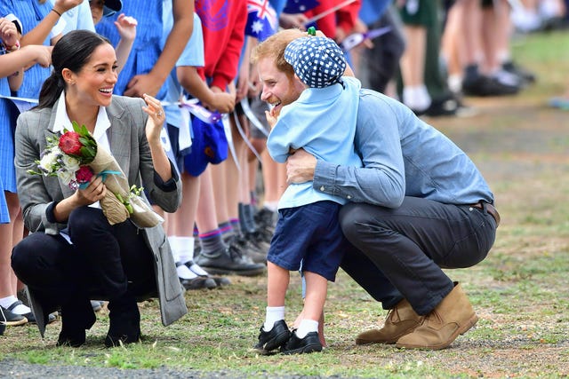 During their royal tour in Australia, Meghan looked at her husband with pure joy as he embraced a young fan at the airport on Oct. 17, 2018 in Dubbo, Australia.
