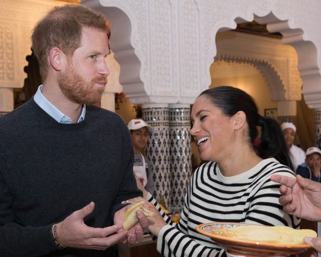 During a cooking demonstration in Rabat, Morocco, on Feb. 25, 2019 Meghan couldn't help but giggle while she watched her husband taste test the food.