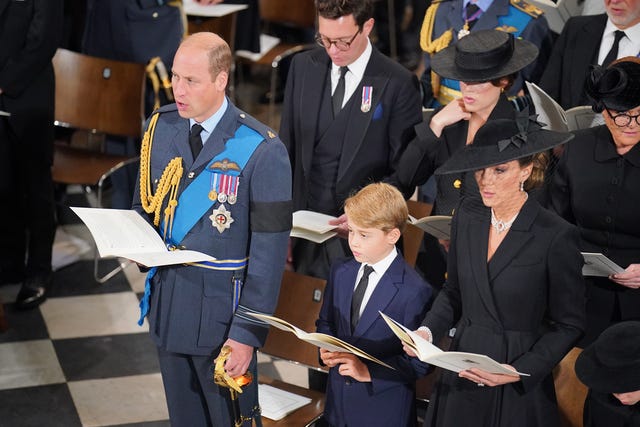 Princess Charlotte and Prince George look at members of the Bearer Party transferring the coffin of Queen Elizabeth II, draped in the Royal Standard, form the State Gun Carriage of the Royal Navy into the State Hearse at Wellington Arch in London.