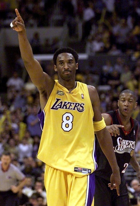 Kobe celebrated scoring in the first half of game two of the NBA Finals against the Philadelphia 76ers. The Lakers would end up winning the series, giving Black Mamba his second ring.