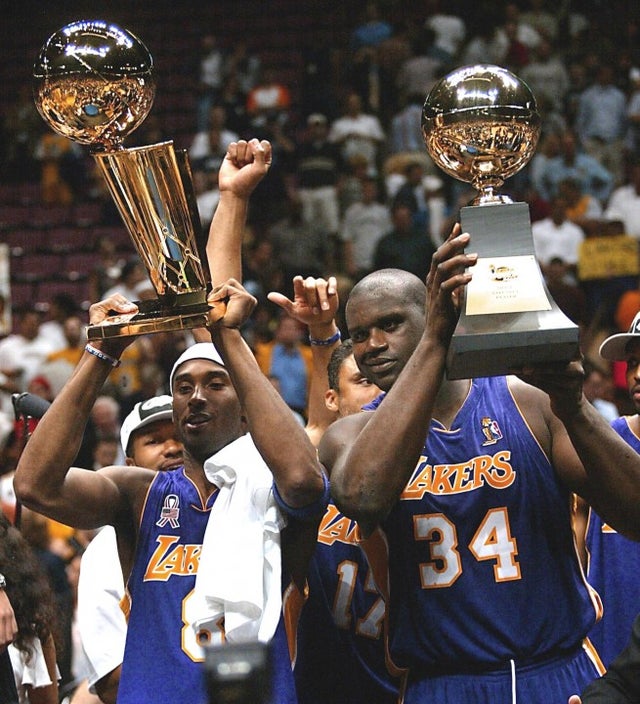 Kobe and Shaq held up the Championship and MVP trophies after sweeping the New Jersey Nets in the 2002 NBA Finals, which marked the Lakers' third consecutive title.
