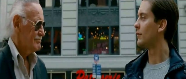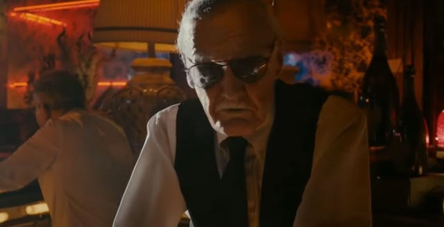 Near the end of the film, Lee bumps into Eddie Brock, who is now one with Venom. While walking away after a conversation with his ex-girlfriend, Anne, Eddie walks past Lee walking his dog. The elderly man advises him, "Hey, don't give up on her. Either of you."