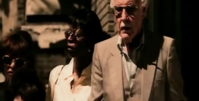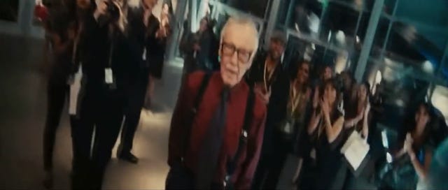 In a familiar cameo spoof for Lee, he plays a bystander oblivious to what's happening around him; this time he's reading a book while the earth is collapsing.