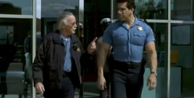 Lee and Lou Ferrigno, who played Hulk on TV, act as security guards.