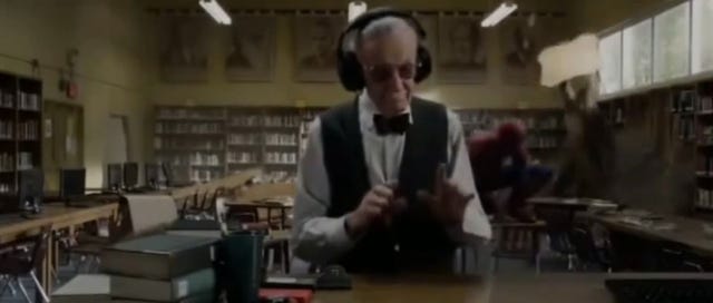 Librarian Lee is jamming out to classical music so hard, he has no idea Spider-Man and the Lizard are engaging in an epic battle behind him -- even when he almost gets hit by a table. Those darn headphones really work!