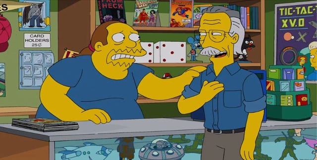 The Marvel icon made a number of appearances on The Simpsons, with his first coming in season 13. Lee headed to Springfield to visit Comic Book Guy and Bart at the Android's Dungeon and Baseball Card Shop, where he critiqued Bart's comic, "Angry Dad." He would later return to voice himself in seasons 25 and 28.
