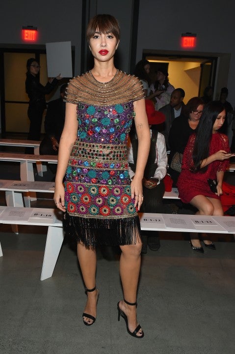 Sitting front row at the Jonathan Simkhai show on Feb. 10 was the former Nickelodeon star in a tri-colored geometric-print midi dress.