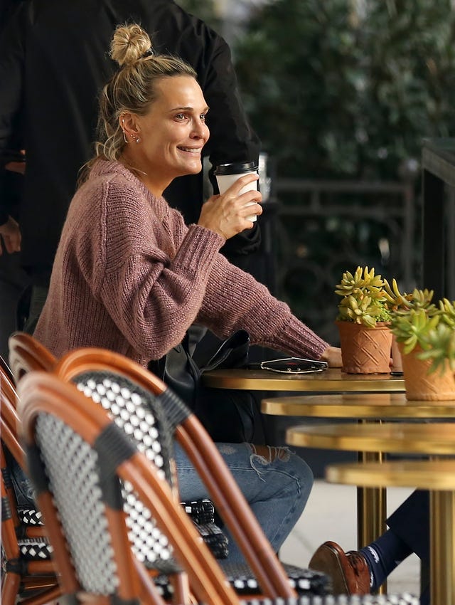 The mom of three let her dewy skin shine through as she grabbed coffee with a friend in Los Angeles in January 2019.