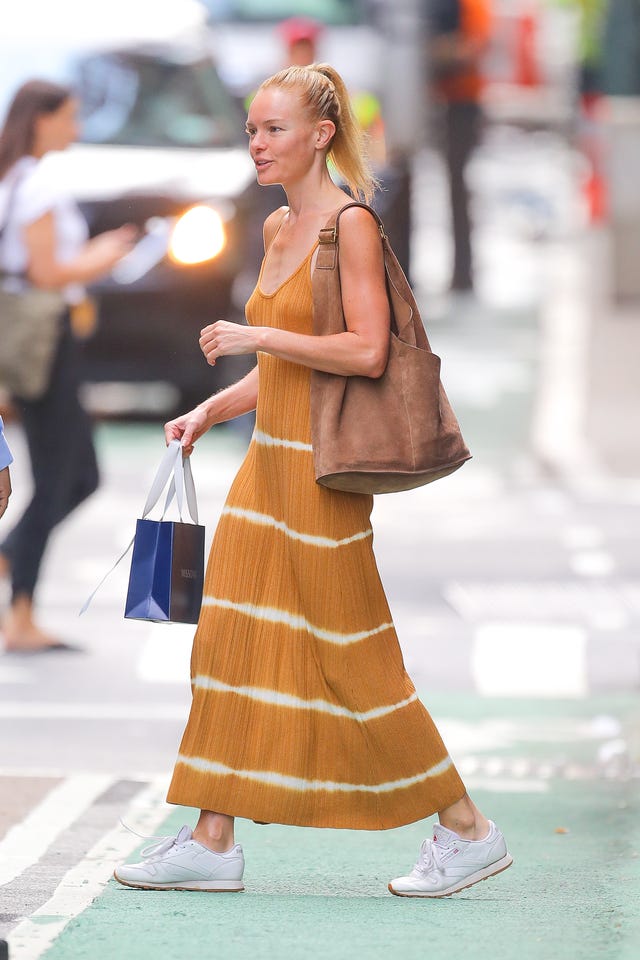 The 36-year-old actress was an au naturel beaut as she left her New York City hotel in August 2019 in a striped yellow dress and white sneakers.