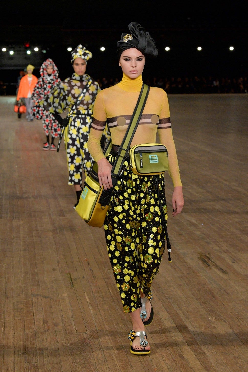 Kaia wrapped up her big NYFW week by closing out the Marc Jacobs show in a canary yellow dress that was adorned with a giant yellow flower embellishment, which she paired with elbow-length black gloves and a matching black head wrap.