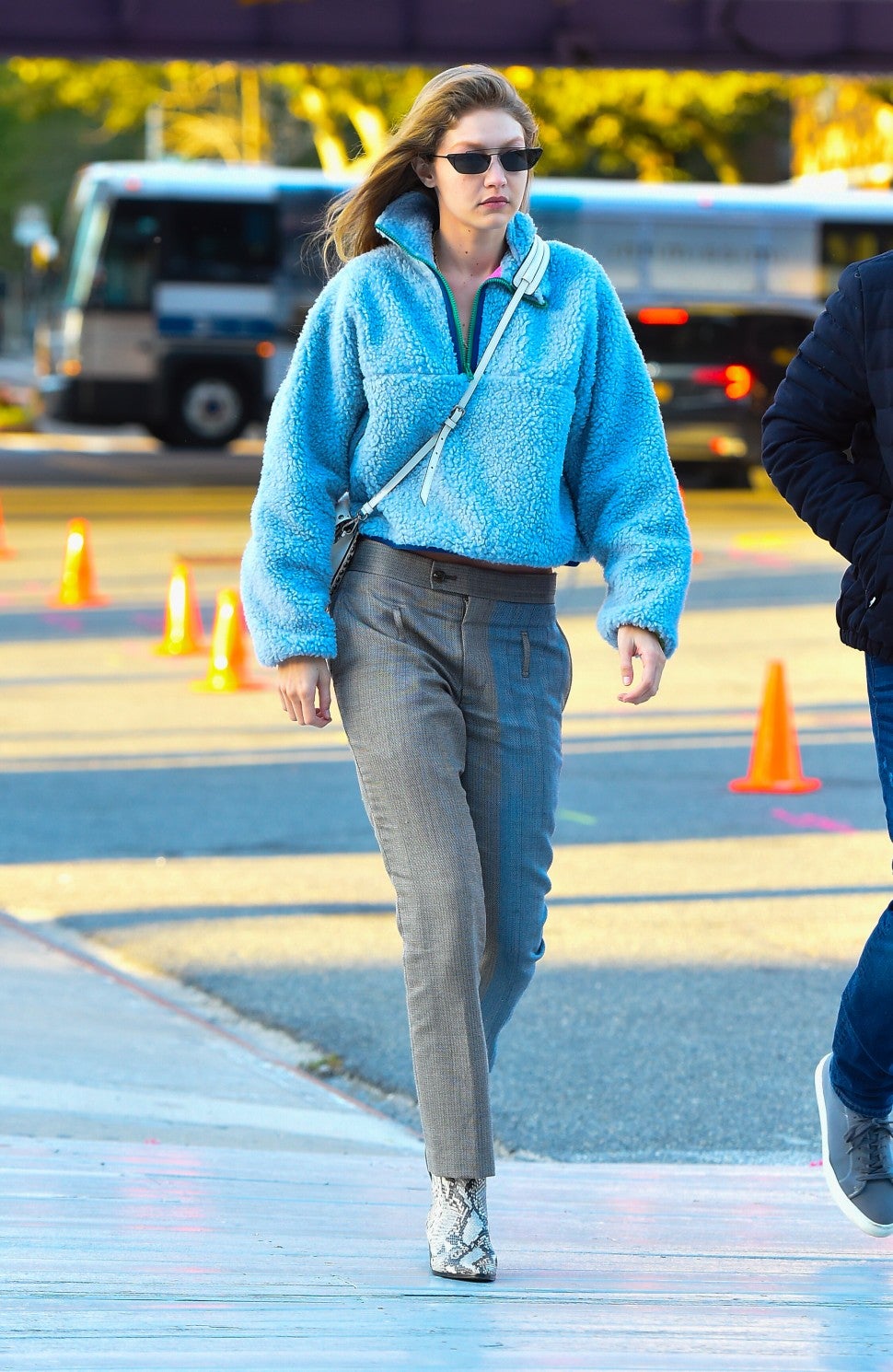 It's cozy, comfy and, most of all, warm thanks to its plushy fabrication that easily layers over tops and under coats. However, it's not something you immediately categorize as a fashion-forward piece. But just as Kendall Jenner elevated her practical puffy jacket, Hadid made the zip-up cool and covetable via her bright blue topper by It designer Sandy Liang, paired with hip-hanging gray trousers, snakeskin boots and shapely shades. We especially adore the vibrant hue, which would look so chic peeking out from a classic coat.