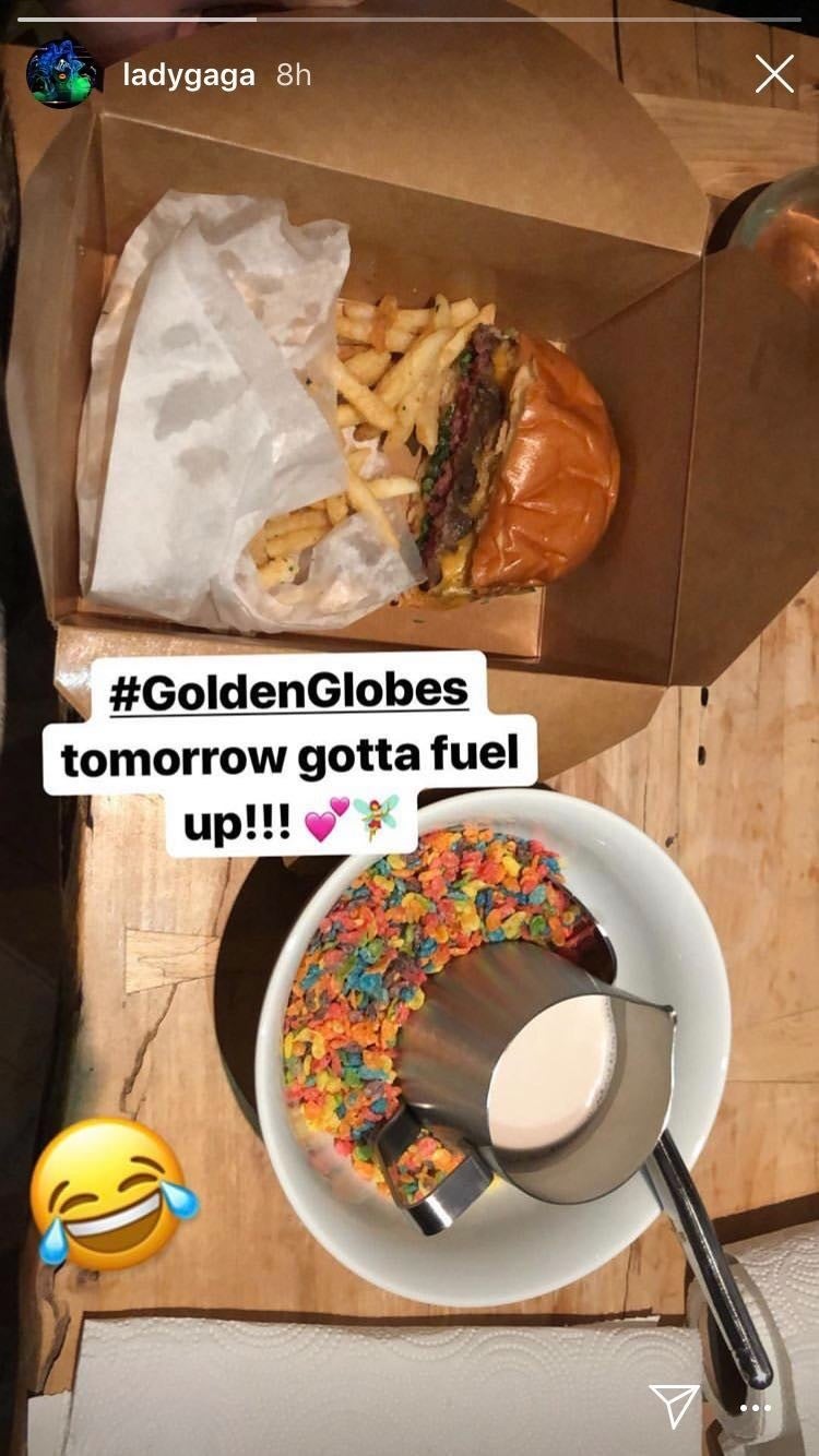 Meanwhile, Lady Gaga, who's nominated twice for her work on A Star Is Born, shared her unusual pre-red carpet meal on her Instagram Story. It seems a cheeseburger, fries and Fruity Pebbles are the key to Gaga's awards show success!