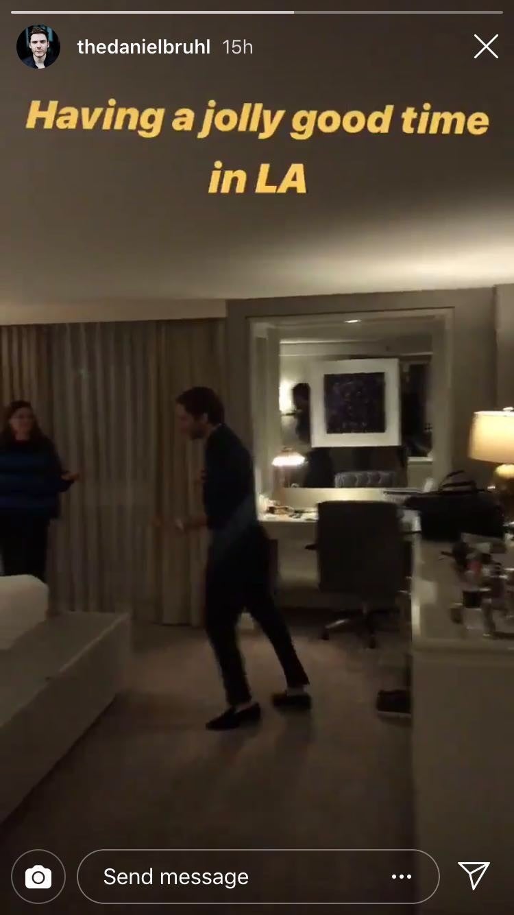 Daniel Bruhl, a nominee for his work on The Alienist, put the serious nature of his show aside to have a "jolly good time" with a dance party in his hotel room.