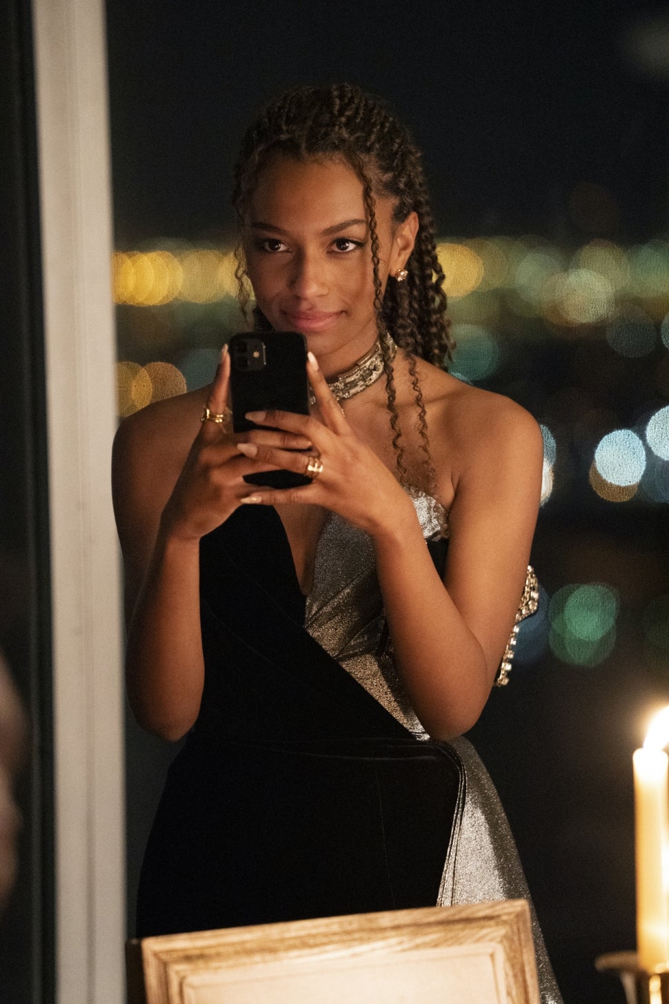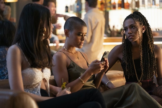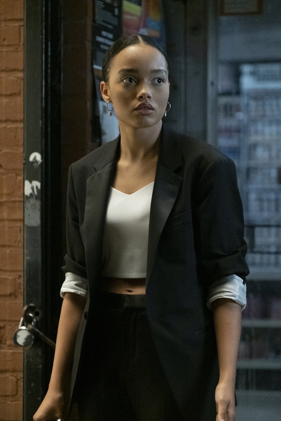 Influencer, model and queen bee, JC is edgy and effortlessly cool. A standout outfit from the pilot was her first day of school look -- an oversized shirt, biker shorts and knee-high boots. Then, she wowed in a '90s-inspired ensemble for a night out in the second episode, outfitted in a moss green slip dress and dangling earrings. In the third episode, she looked stunning in a black mesh catsuit.