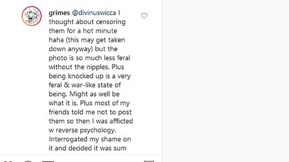 On Wednesday, the 31-year-old singer shared a topless photo of herself on Instagram with what appears to be a baby bump. When a fan commented on the NSFW pic, "Love how you don't even censor the nipples sis, you look great," Grimes replied that she was "knocked up."