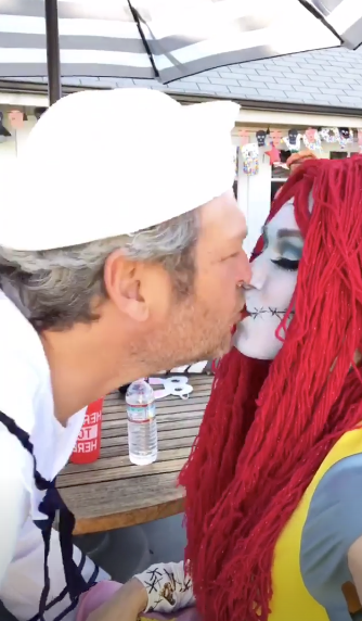 On Saturday, the couple attended the festive costume party where she and Blake didn’t hesitate to flaunt some PDA for the camera. While dressed as Sally, an undead beauty from The Nightmare Before Christmas, the 49-year-old singer shared a video in Instagram Stories in which she and Shelton share a quick smooch.