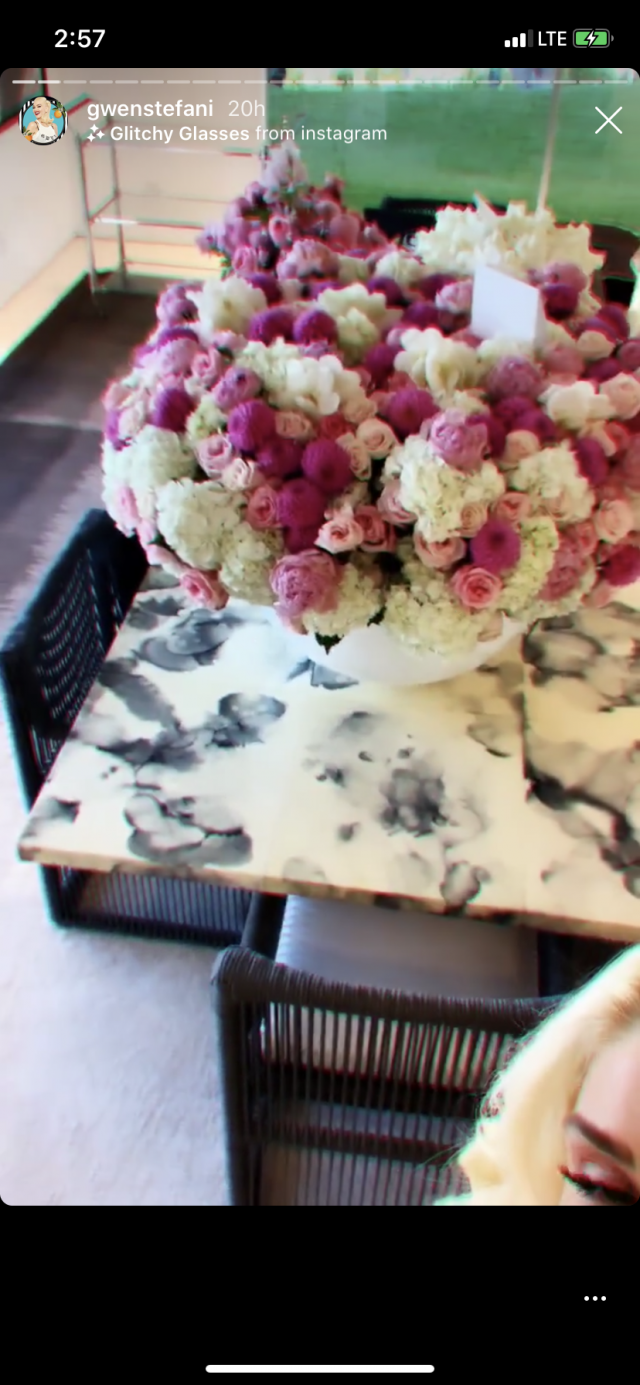 In the posts, Stefani shared pics and videos of her boyfriend, Blake Shelton's, extravagant gift, a giant bouquet filled with pink and white flowers.