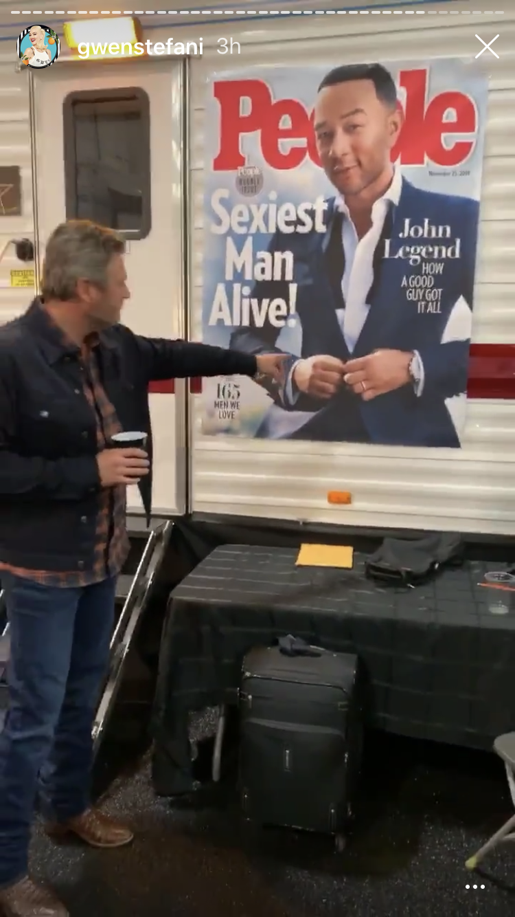 Later in the evening, after it was announced on the show that John Legend had been named Sexiest Man Alive -- a role previously held by Shelton himself -- Stefani jokingly shared her condolences with her boyfriend while standing next to a giant poster of Legend's People Magazine cover.
