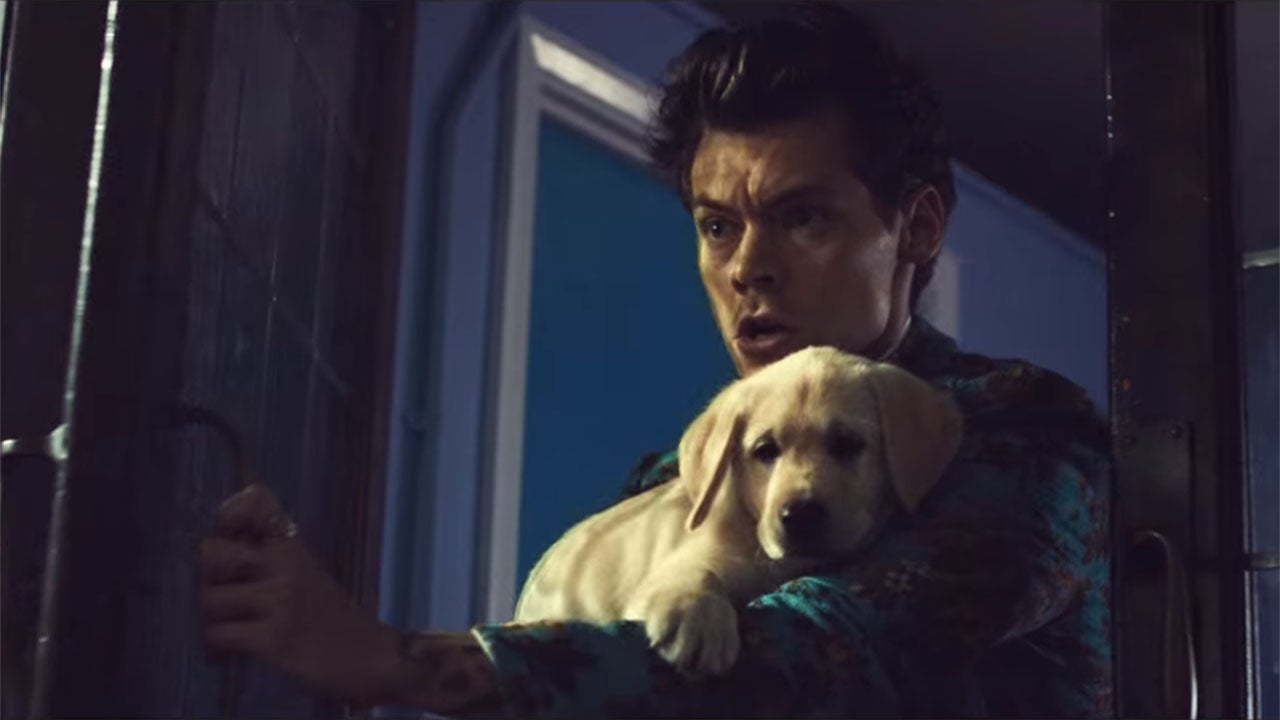 And he’s not alone. Styles is carrying a yellow Labrador puppy, surveying the situation before letting the dog on the ground and unleashing a litter of puppies to eat up the mess.