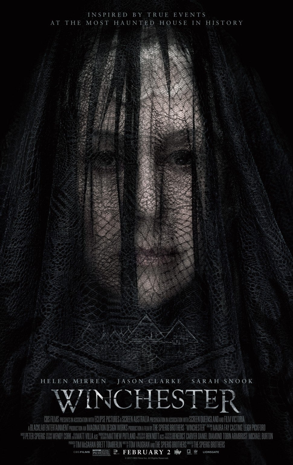 "Inspired by true events. On an isolated stretch of land 50 miles outside of San Francisco sits the most haunted house in the world. Built by Sarah Winchester (Mirren), heiress to the Winchester fortune, it is a house that knows no end. Constructed in an incessant twenty-four hour a day, seven day a week mania for decades, it stands seven stories tall and contains hundreds of rooms. To the outsider it looks like a monstrous monument to a disturbed woman’s madness. But Sarah is not building for herself, for her niece (Sarah Snook) or for the troubled Doctor Eric Price (Clarke) whom she has summoned to the house. She is building a prison, an asylum for hundreds of vengeful ghosts, and the most terrifying among them have a score to settle with the Winchesters…"