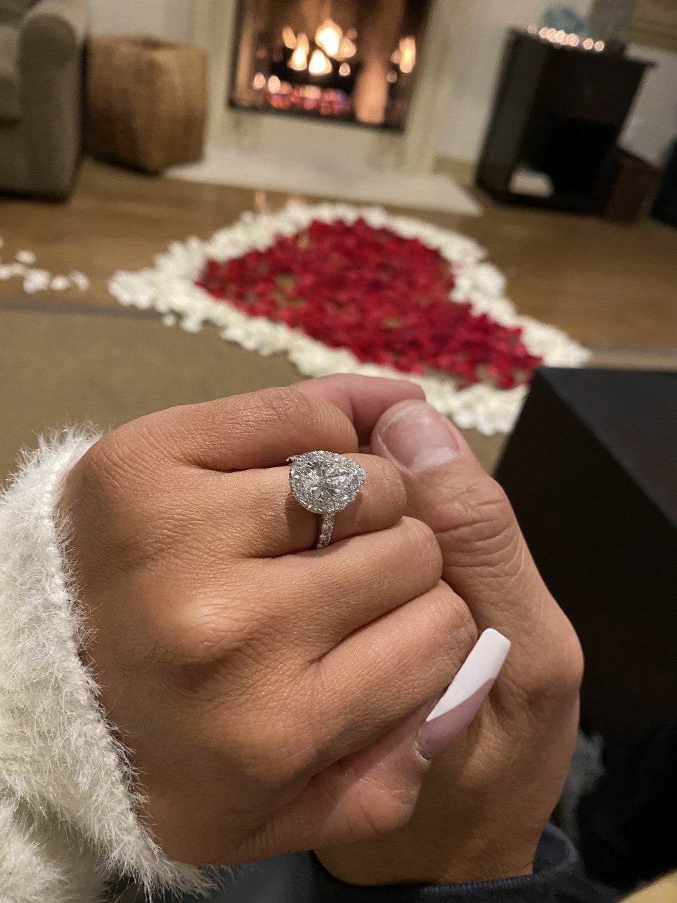 The couple also showed off Makk's stunning pear-shaped engagement ring, with a diamond band. In the background, a red-and-white heart made out of rose petals can be seen.