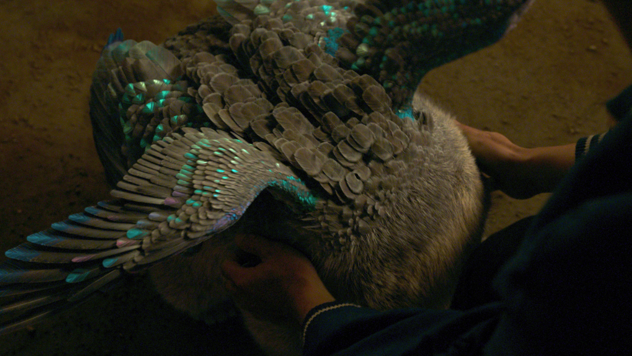 We had a few things. We were shooting and prepping and things down in Australia, and one of the props people found online a stuffed wombat. If you've ever seen a wombat, it's very much like Morris. If you took a wombat, added a couple more legs, took off the face and added some wings, that's Morris. It was really interesting. So, we had this stuffed toy that we brought in. And then from that, we had the props department build some green stuffies shaped like Morris without wings and legs, just something that our actors could touch and hold. And one of the things that I really wanted as well was it to be heavy enough. I'm always very aware watching films when people pick up a suitcase and there's nothing in it. You're like, "Oh, come on." And it would be a heavy, heavy creature. It's got a lot of bulk to it. So, we put sandbags inside to make it nice and heavy so that when the actors lift it up, it had some weight to it. So, we did it with this green cushion, basically.