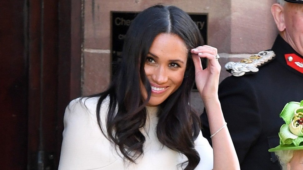 For her first solo appearance sans Prince Harry, Meghan Markle accompanied the queen to Cheshire, England, and all eyes were on the Duchess of Sussex as she stepped out in an elegant off-white dress with a statement shoulder overlay.