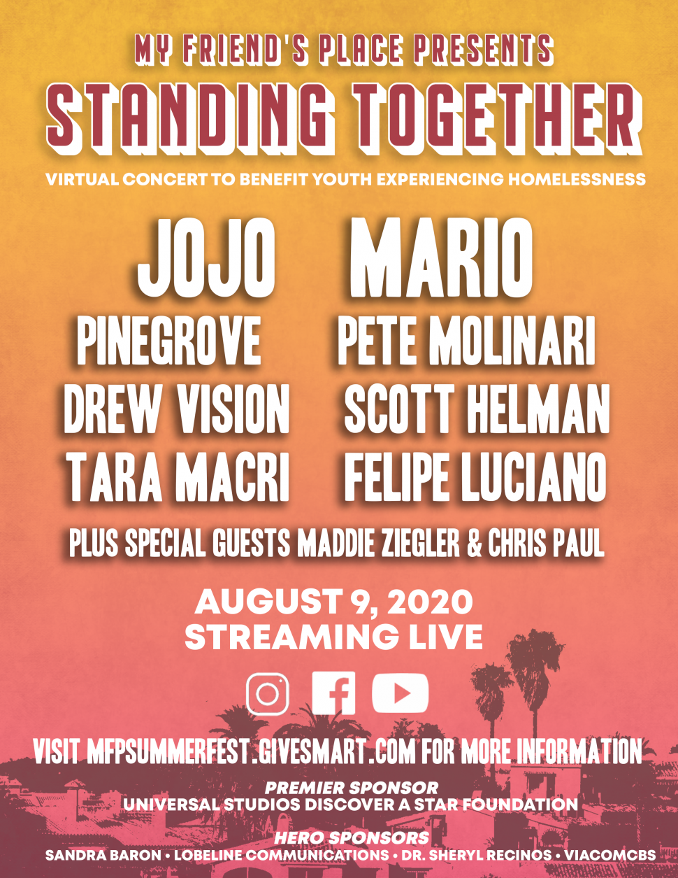 Providing assistance, shelter and education for unhoused young people in Los Angeles since 1988, this year, My Friend's Place's annual Ending Youth Homelessness Gala, which was canceled due to the coronavirus pandemic, has been replaced by the virtual My Friend's Place Summer Festival, kicking off with this concert on Sunday.