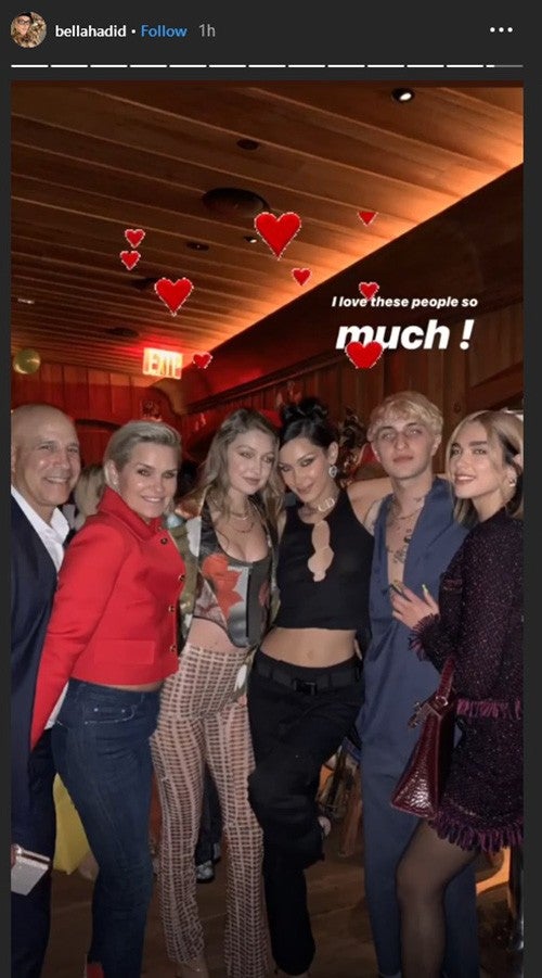 Bella looked incredible at her party, showing off her toned stomach in a black crop top, pants, a sparkly Christian Dior choker and show-stopping earrings. Her famous family was of course in attendance -- mom Yolanda, sister Gigi, brother Anwar and Anwar's girlfriend, Dua Lipa -- as well as Kaia Gerber, Lily-Rose Depp, Stella Maxwell, Joan Smalls, Justine Skye and Diana Silvers.