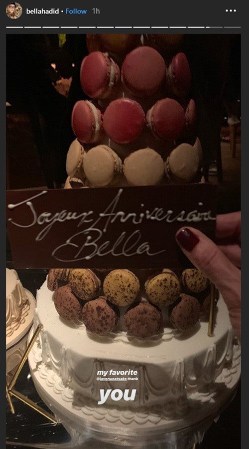 During the star-studded party, Anwar took it upon himself to play DJ with a phone that was plugged into the bar's speaker system, and fittingly, his playlist included a Weeknd hit -- "Nocturnal." When the clock struck midnight, the team at L'Avenue at Saks surprised Bella with an 11-tier macaroon cake flanked by two smaller 4-tier macaroon towers with birthday candles and a chocolate wish saying, "Joyeux Anniversaire Bella!"