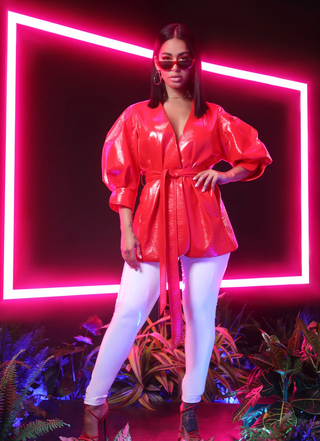 This vegan pebbled patent red leather jacket features exaggerated puff sleeves and a belt.