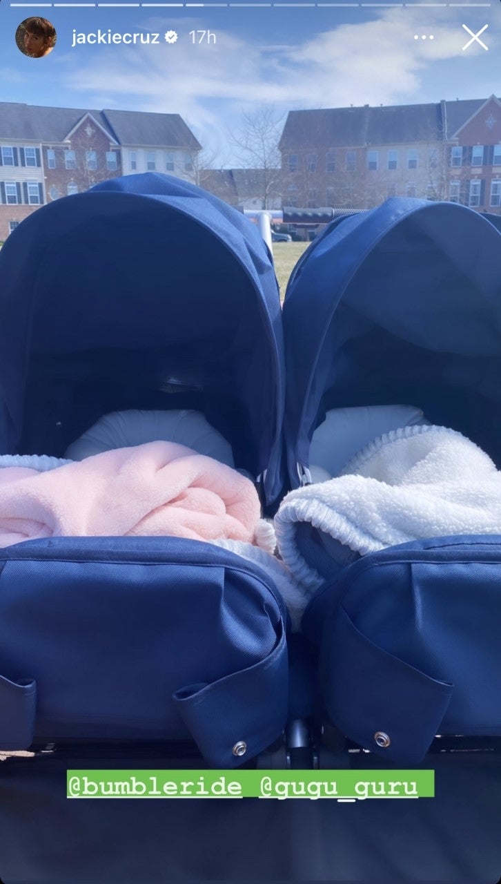 The "Be Bad" singer also shared another look at her babies via her Instagram Stories. Cruz posted a picture of her little ones in their “new wheels” -- a double stroller. The actress kept their faces covered, with a blue blanket over one and a pink blanket over the other, hinting at a girl and a boy.