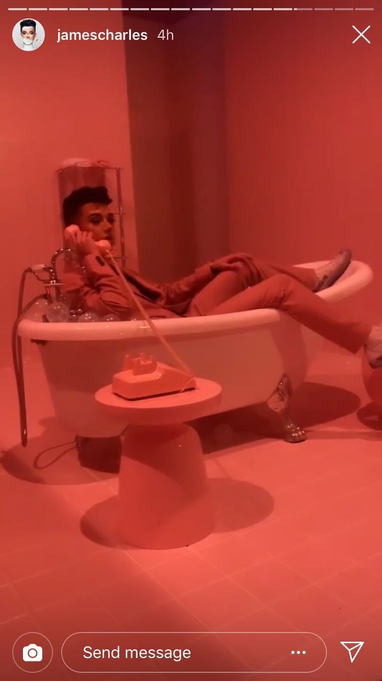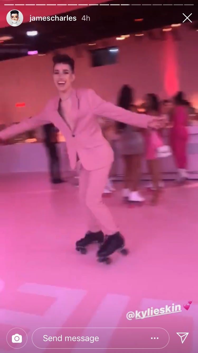 It seems any beef with Kylie is a thing of the past, though, as James appeared in the background of one of her Instagram Story posts and was seen laughing at the bar with a group. The event itself was pink-hued, complete with branded food, a bathtub to pose in and a skating rink, so James was perfectly dressed in his pink suit.