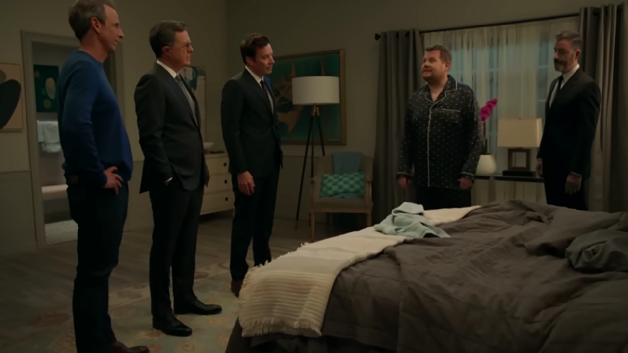 In the bit, Corden is asleep at home when he's visited by fellow late-night comedians Seth Meyers, Jimmy Kimmel, Stephen Colbert, Jimmy Fallon, and retired Late Show host David Letterman.