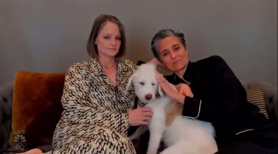 Golden Globe winner Jodie Foster and her wife, Alexandra Hedison, opted for luxurious pajamas during the Golden Globes ceremony. The 58-year-old actress donned a printed silk pajama set (which happened to match the bandana on her dog!) from Prada while Hedison chose a darker, contrasting option from Derek Rose.