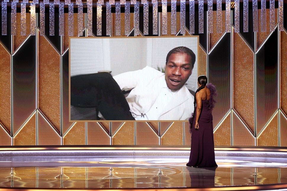 You may not have caught Golden Globe winner John Boyega's cozy pants on screen during Sunday night's award show until his virtual acceptance speech. The 28-year-old actor revealed his black Balenciaga track pants to the camera as he received his reward.