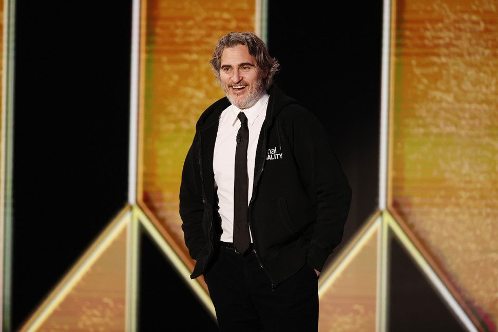 Rather than sporting that traditional blazer or tuxedo jacket often associated with formal events like awards shows, Golden Globes presenter Joaquin Phoenix sported a simple black hoodie that stated "Animal Equality" on the front.