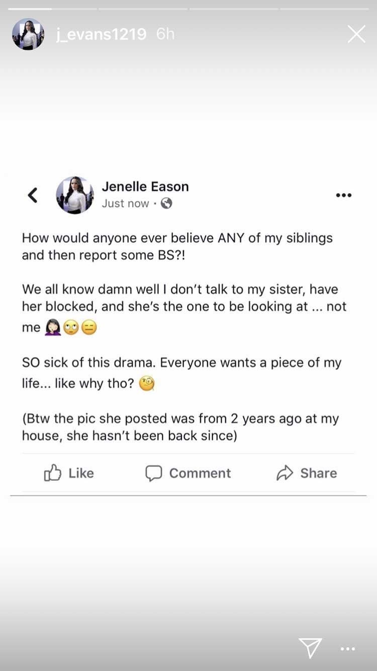 It's unclear what Evans is accusing her estranged sister of when she says, "She's the one to be looking at," but the reality star then doubled down on her claims of victimhood, adding, "So sick of the drama. Everyone wants a piece of my life… like why tho?"