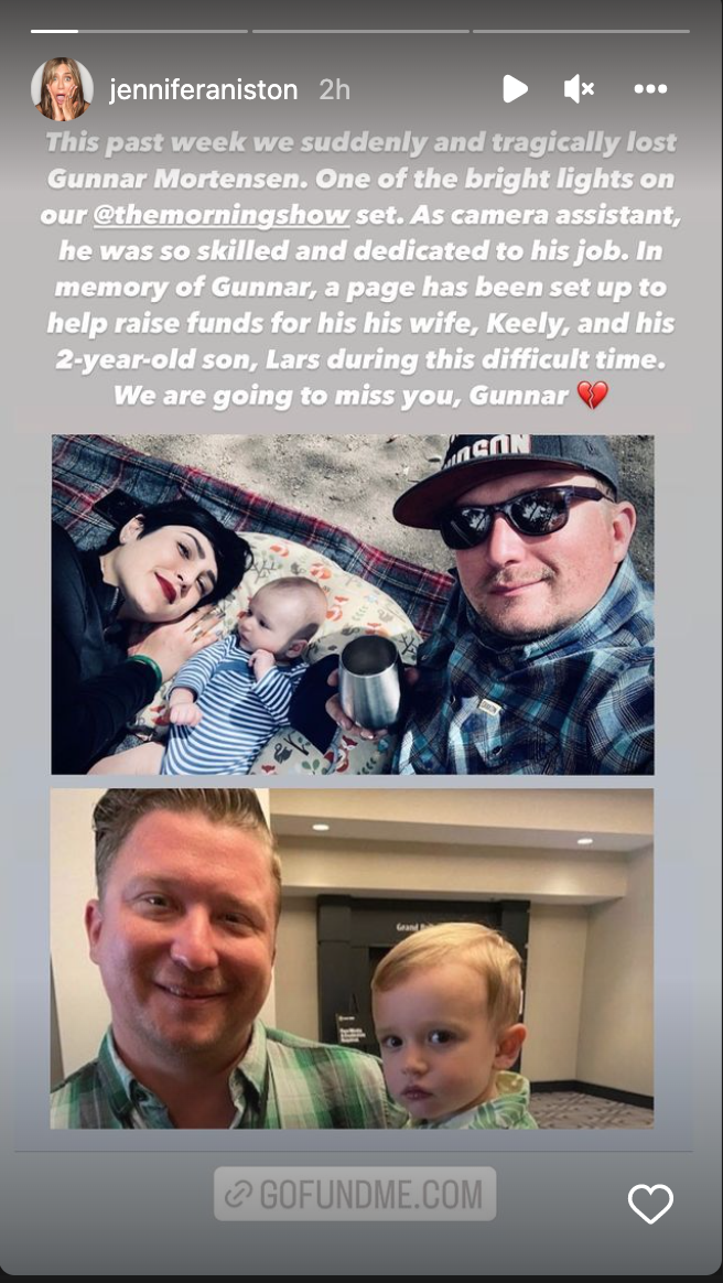 "This past week we suddenly and tragically lost Gunnar Mortenson," Aniston wrote on her Instagram story. "As a camera assistant, he was so skilled and dedicated to his job. In memory of Gunnar, a page has been set up to help raise funds for his wife, Keely, and his 2-year-old son, Lars during this difficult time. We are going to miss you Gunnar 💔"