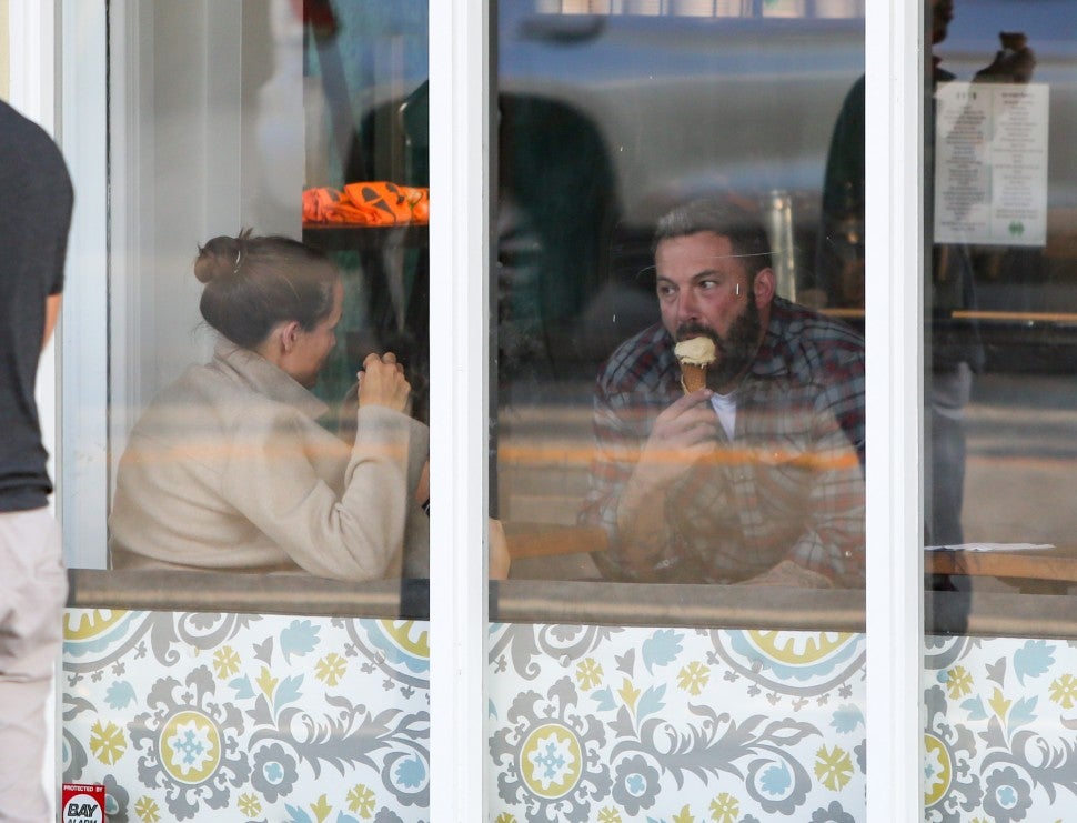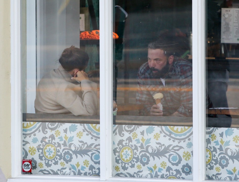 Garner was casual cool in a tan jacket, white t-shirt and jeans, topped off with a loose bun and shades. Affleck was equally relaxed in a plaid shirt and denim.