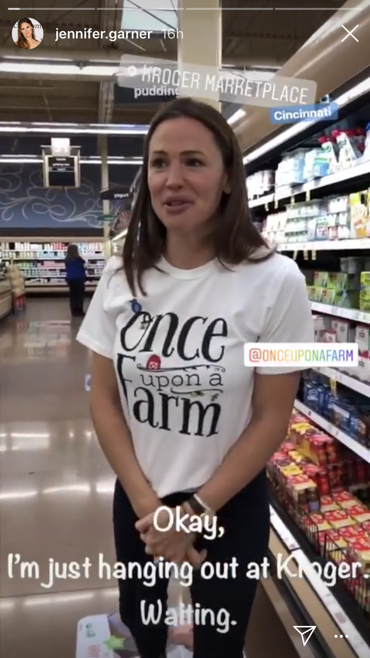 Garner, wearing a T-shirt with her company’s name on it, starts out hopeful during her video series on Instagram Story, saying, “OK, I’m just hanging out at Kroger. Waiting.”