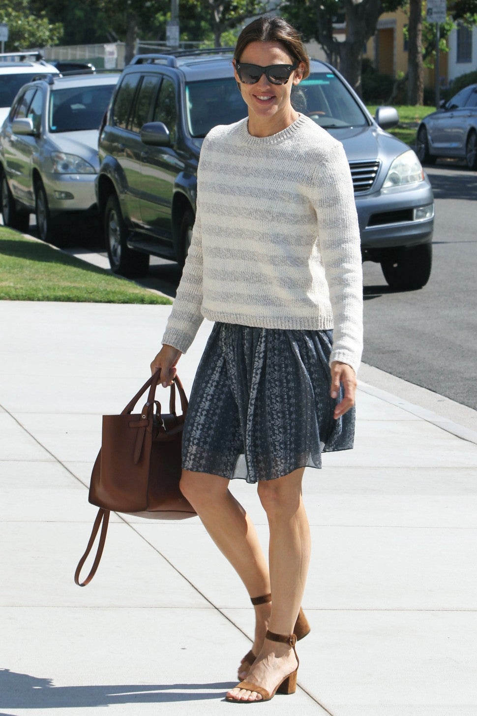 The Camping star headed to church in Pacific Palisades, California, wearing a striped gray sweater and printed dark blue skirt, completed with brown ankle-strap sandals by Gianvito Rossi and a matching bag. The comfy-chic look was appropriate for service, but was still perfect for the middle of summer, thanks to her floaty above-knee mini and neutral-colored accessories.