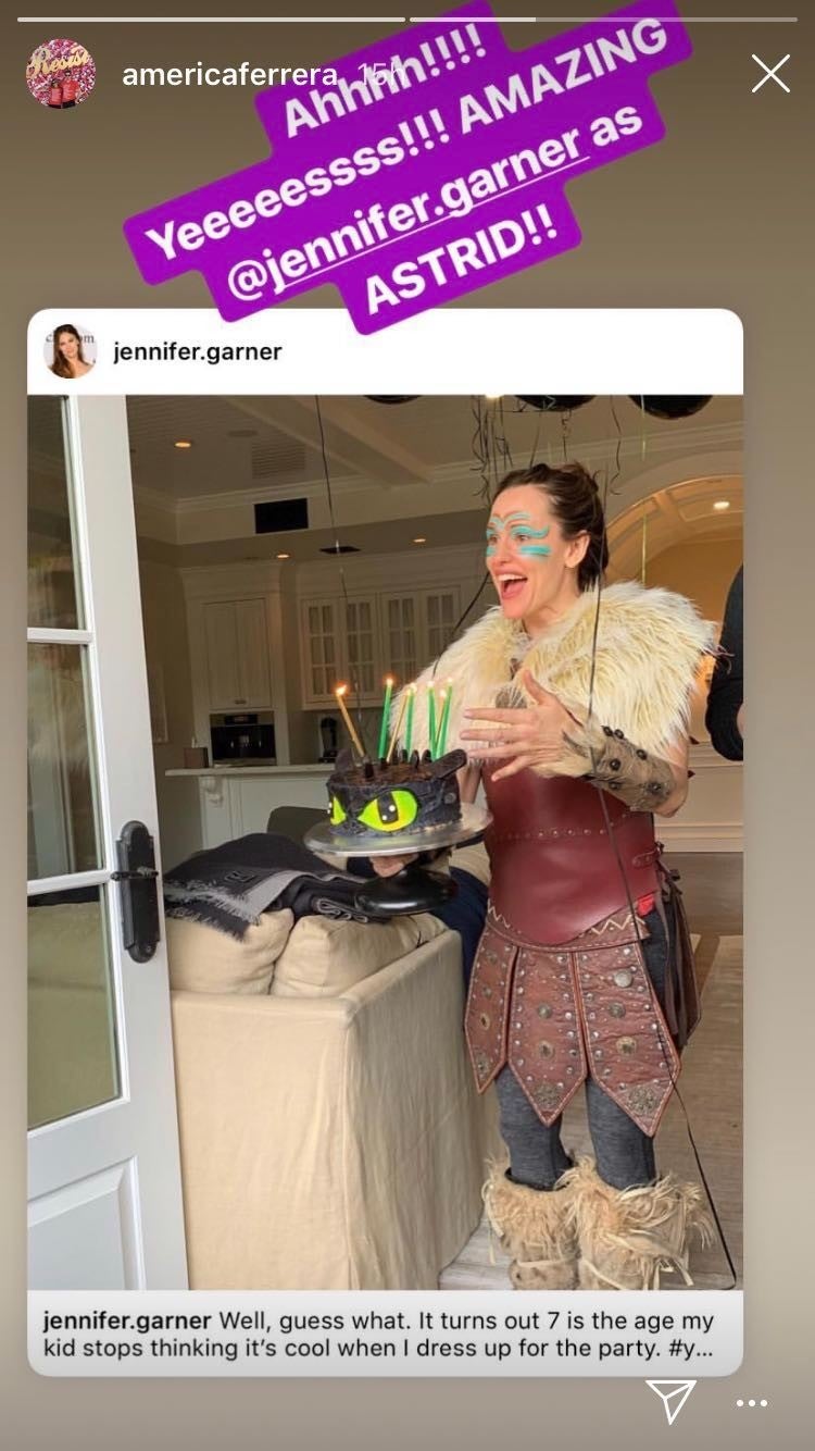 As Garner excitedly brought out the cool cake, she surprised her son, whom she shares with ex-husband Ben Affleck, by donning the costume of the flick's female viking warrior, Astrid. Wearing fur boots and a matching shawl, along with some leather armor and blue face paint, Garner was the spitting image of Astrid, who was voiced by America Ferrera in the movie.