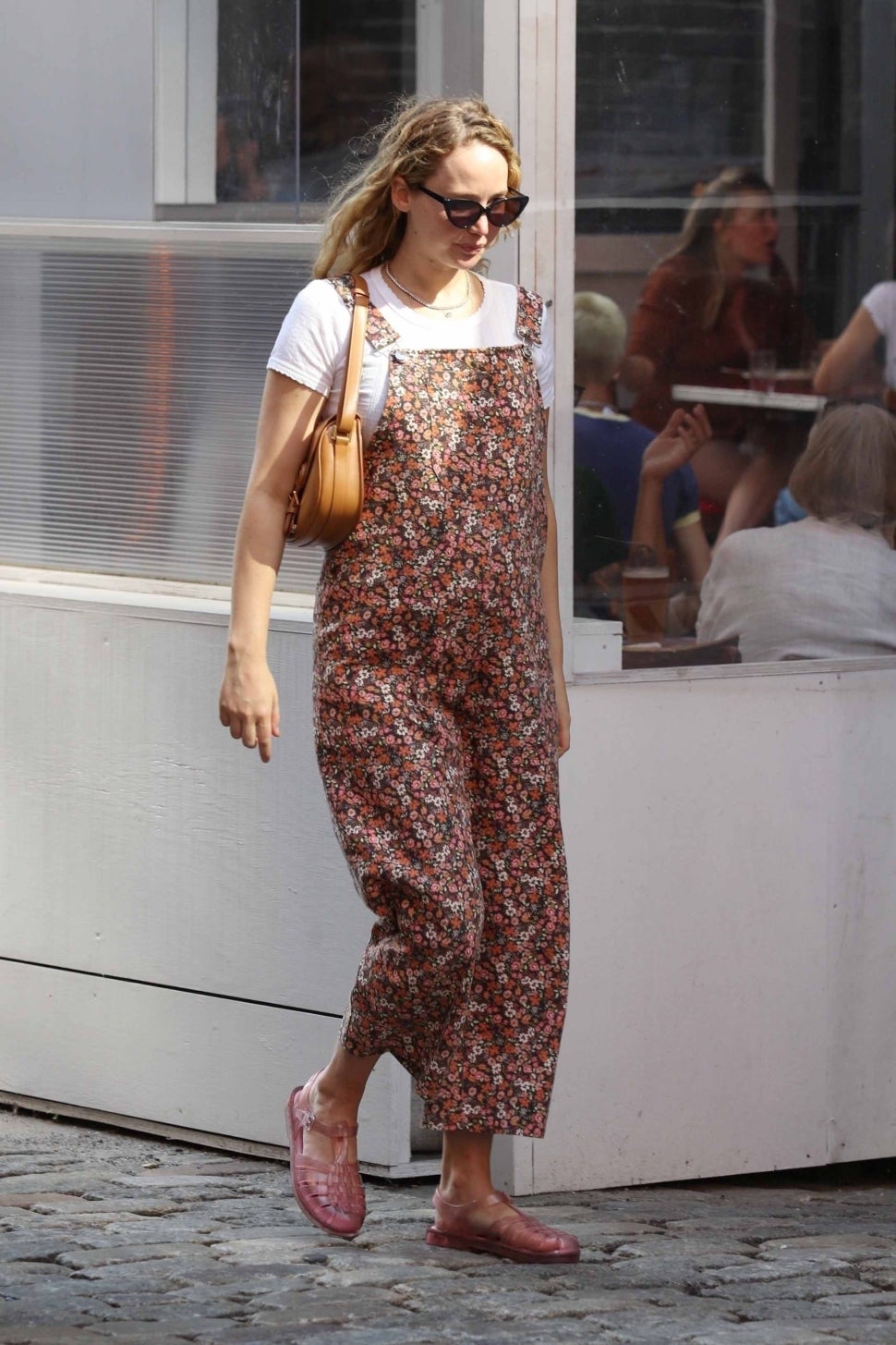 On Thursday, the 31-year-old actress was sporting a tiny baby bump while out and about in downtown Manhattan wearing a white T-shirt, floral overalls and jelly sandals. She accessorized with a tan purse and sunglasses.