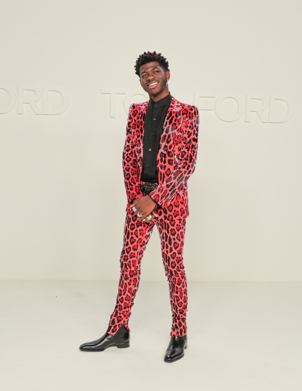 Lil Nas X turned heads in a red leopard print embroidered pantsuit, black shirt and leather Chelsea boots.