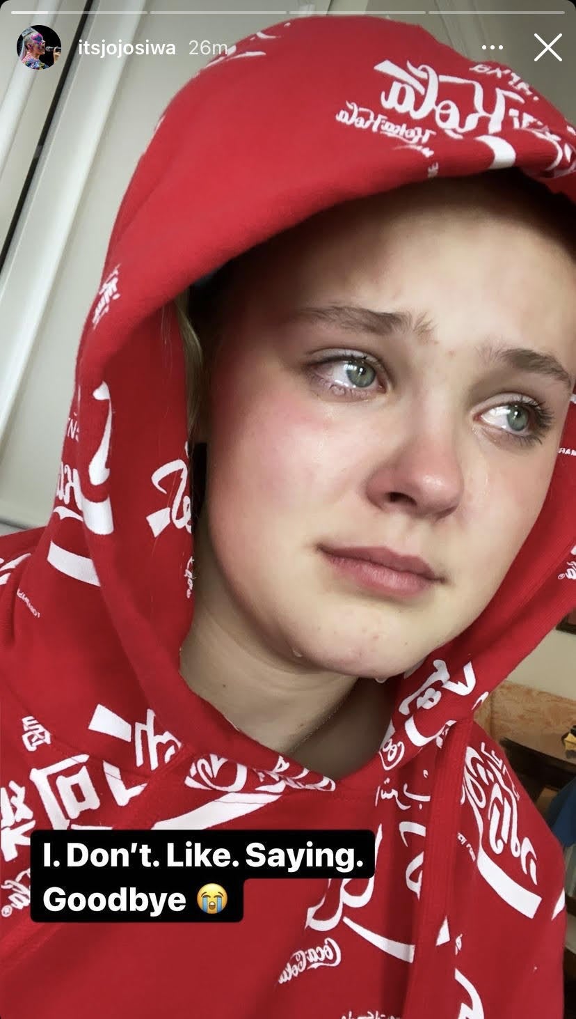 JoJo Siwa finds it hard to be away from her girlfriend, Kylie Prew. The 17-year-old performer and social media star posted a crying selfie on her Instagram Stories on Monday, writing, "I. Don't. Like. Saying. Goodbye."